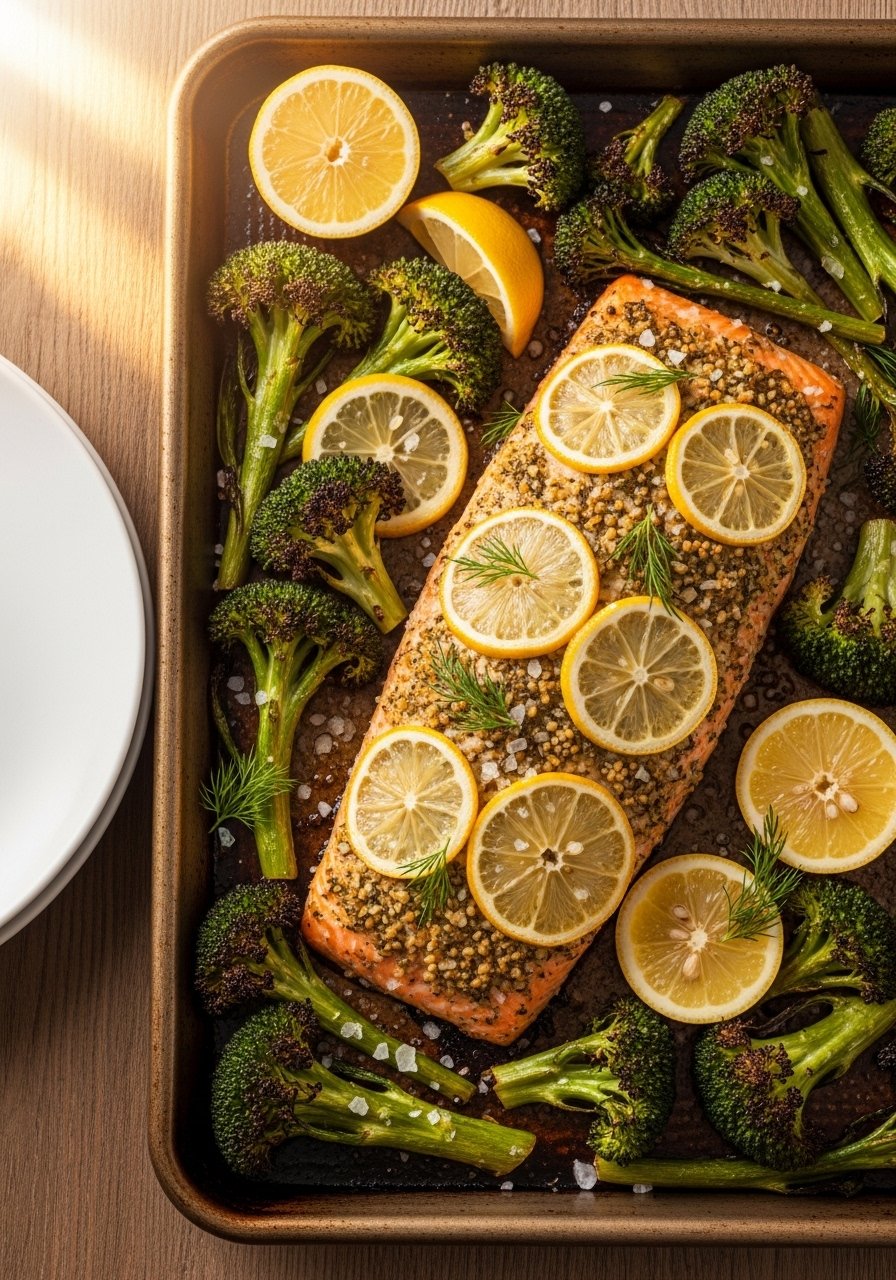 - Roast 12–15 minutes until salmon flakes easily and broccoli has browned edges. Squeeze lemon juice over before serving.