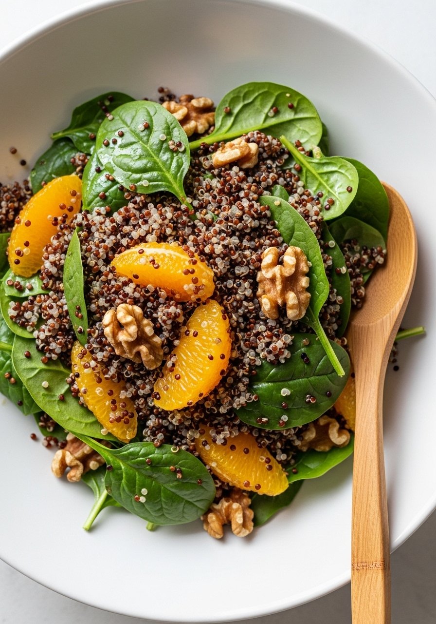 - In a bowl, mix quinoa, spinach, orange segments, and walnuts. Drizzle dressing and toss to coat.