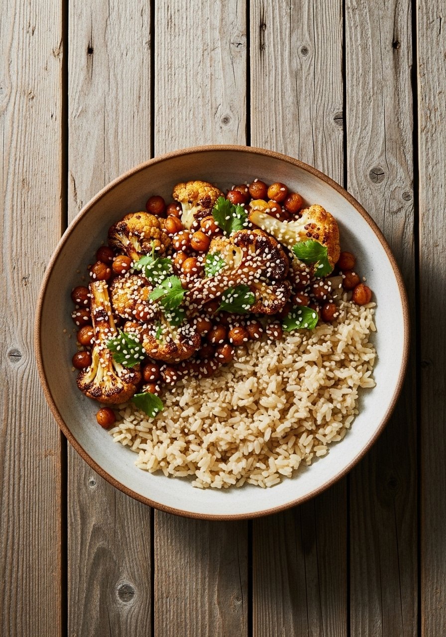 - Spread on sheet and roast 25–30 minutes, turning once, until cauliflower is golden and chickpeas crisp. Serve over grains.