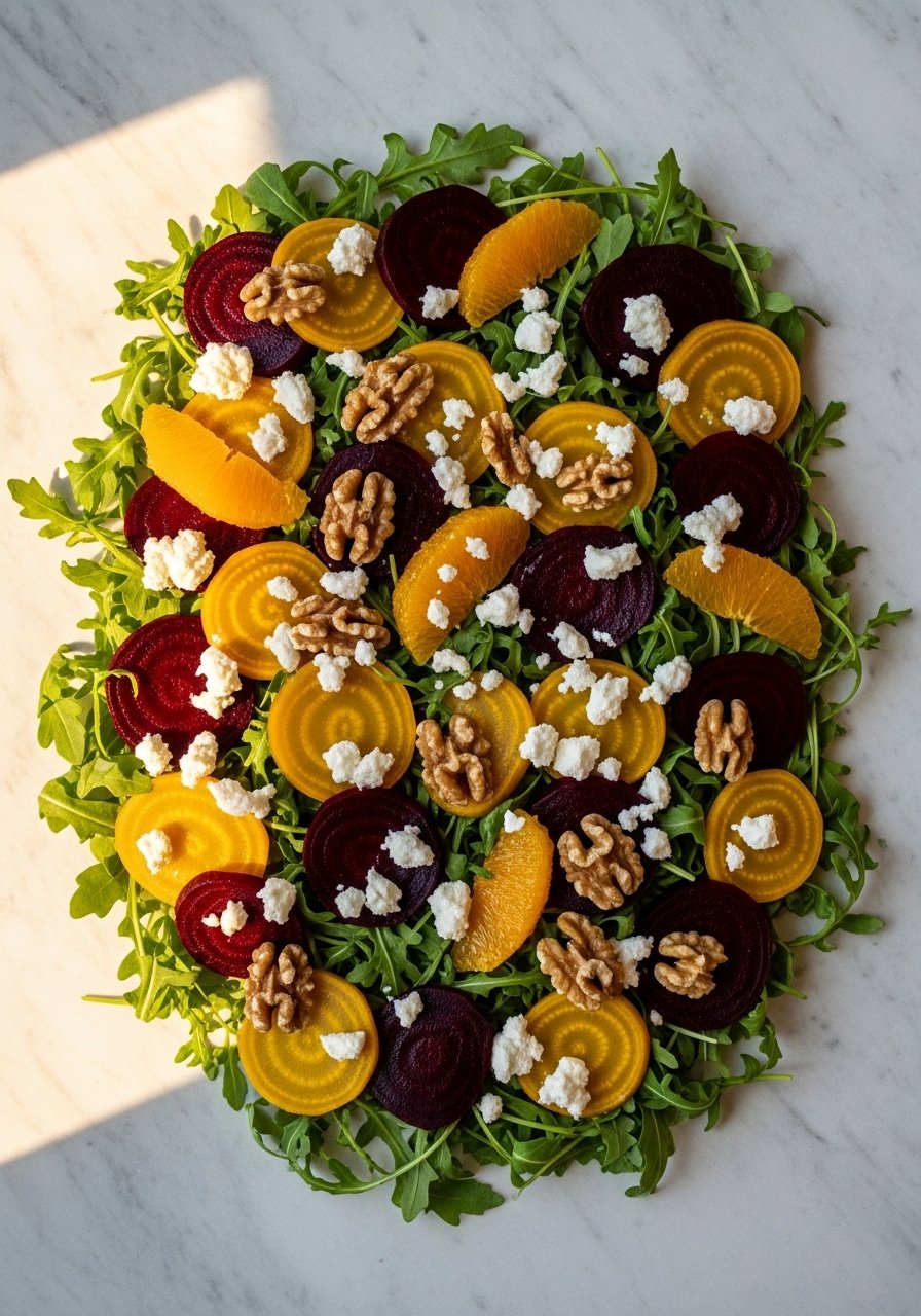 - In a bowl, combine arugula, sliced beets, and orange segments.