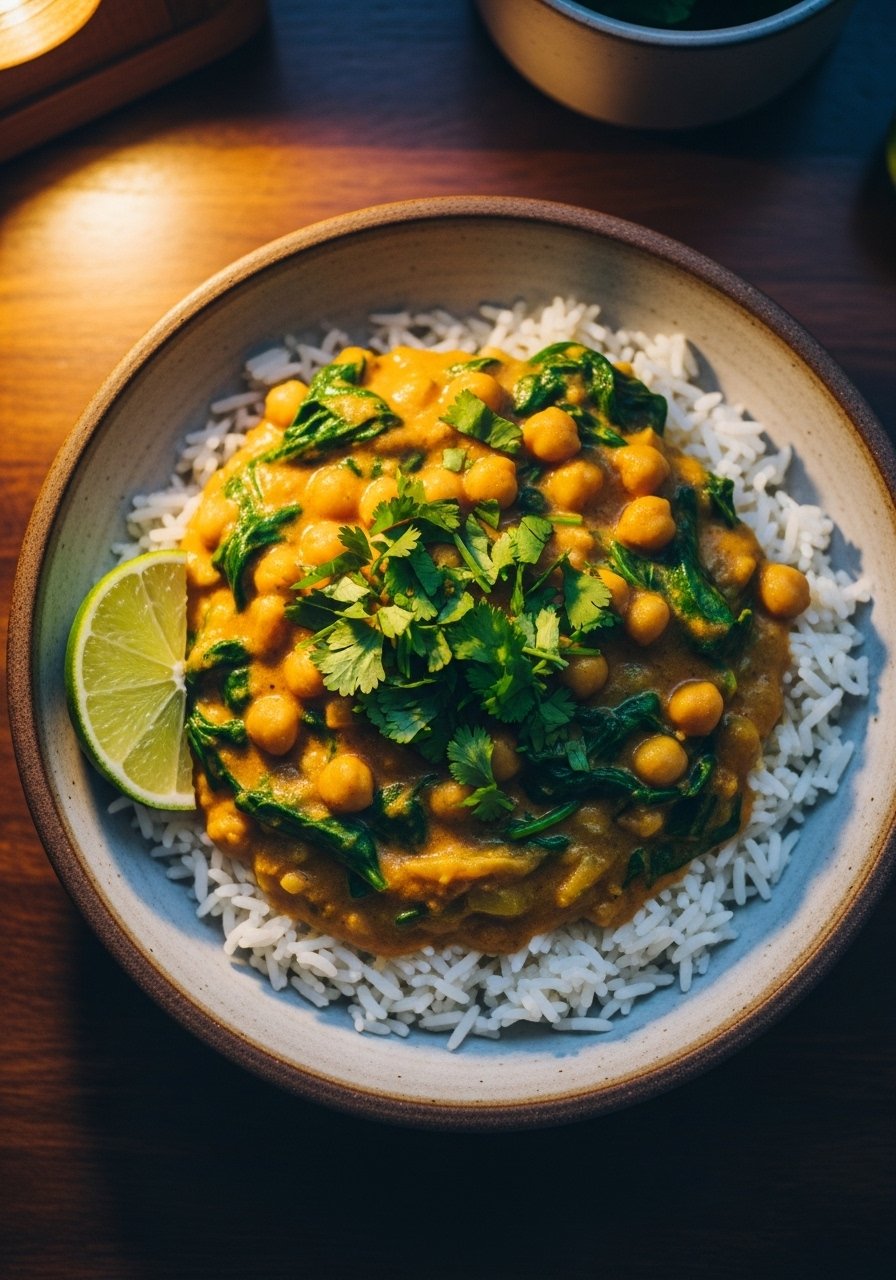 - Stir in curry powder, then add chickpeas and coconut milk. Simmer 8–10 minutes to thicken.