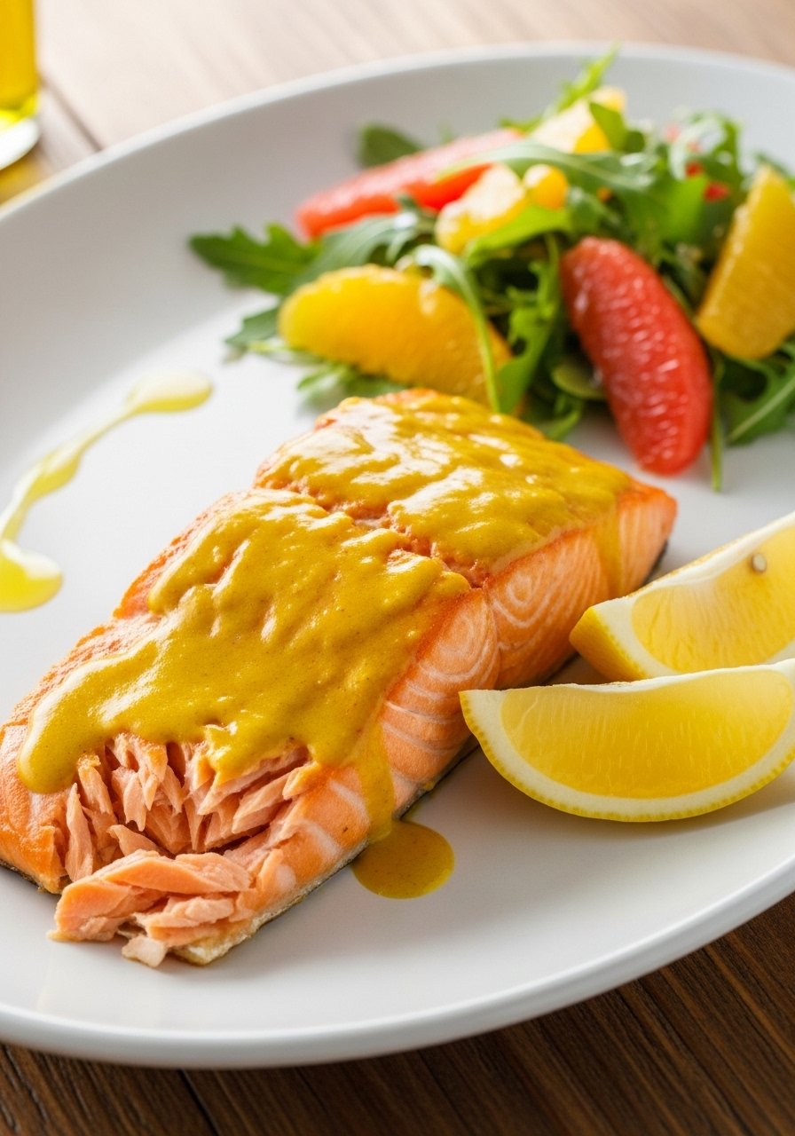 Bright, slightly spicy salmon with citrusy greens. Flaky, tender fish contrasts with crisp salad; turmeric and ginger add warmth without heaviness—perfect for a filling, slimming dinner.