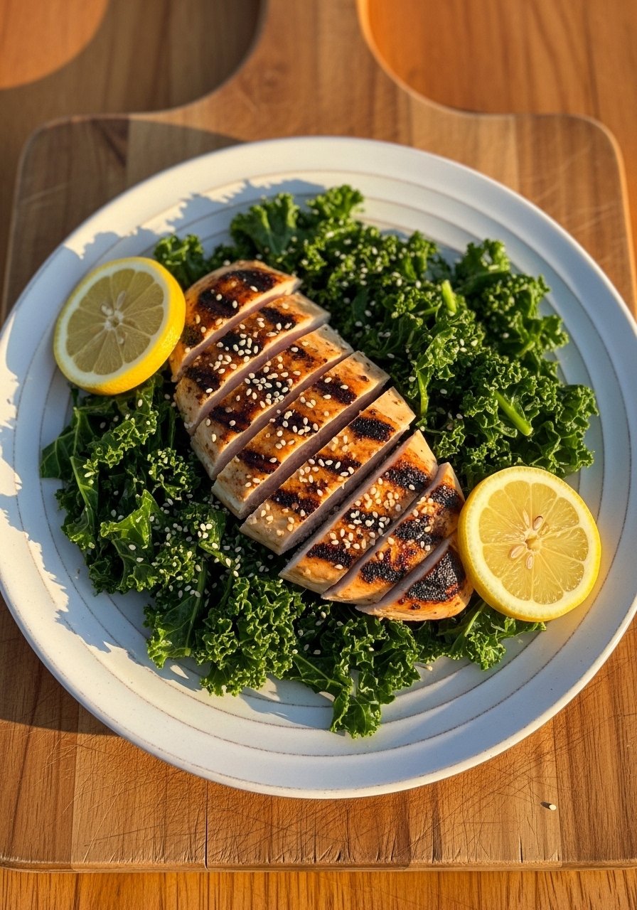 Juicy grilled chicken with bright lemon and garlic. Massaged kale becomes tender and pairs well with lean protein for a satisfying, low-calorie meal.