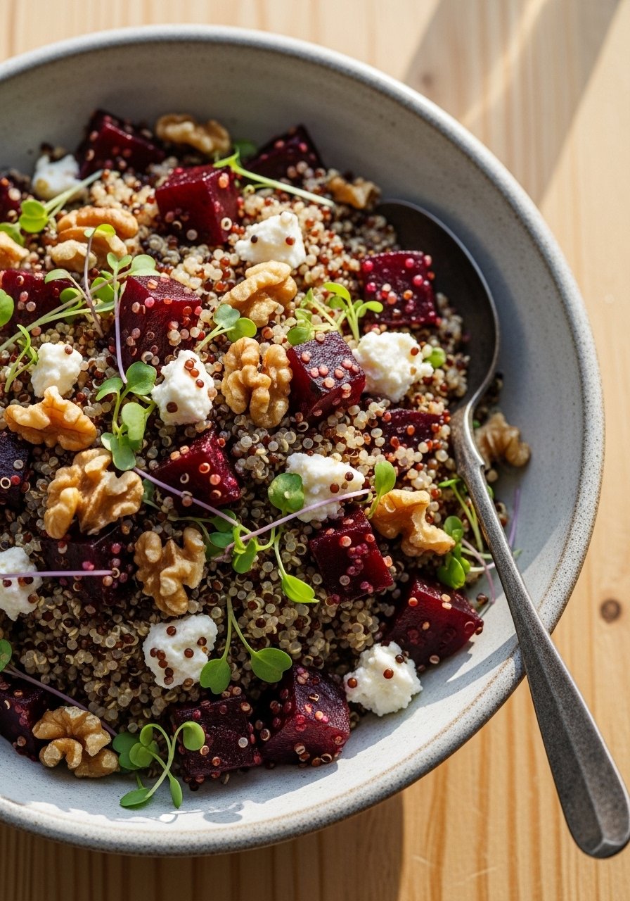 - Assemble Salad: Toss: Mix quinoa, beets, walnuts, feta, lemon juice, and olive oil. Season to taste.