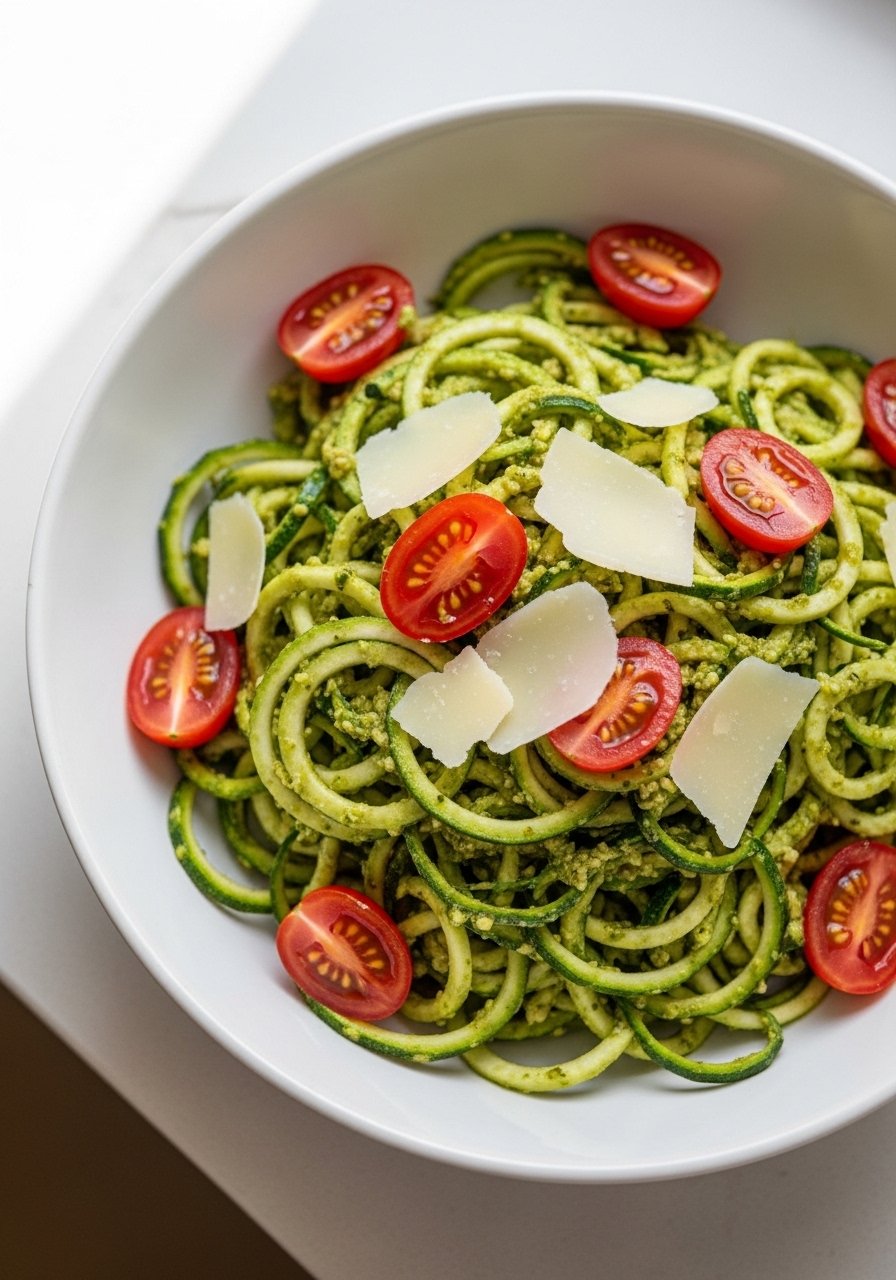 Light zucchini noodles tossed in herby walnut pesto. Creamy without heavy cheese, this bright plate is low-carb and satisfying.