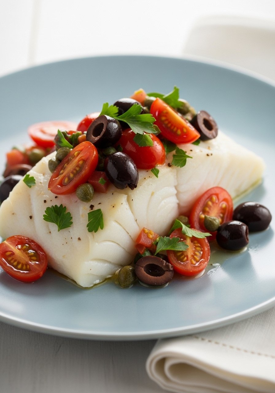 Light, flaky cod topped with bright tomato-olive relish. High in lean protein and Mediterranean flavors that calm inflammation.