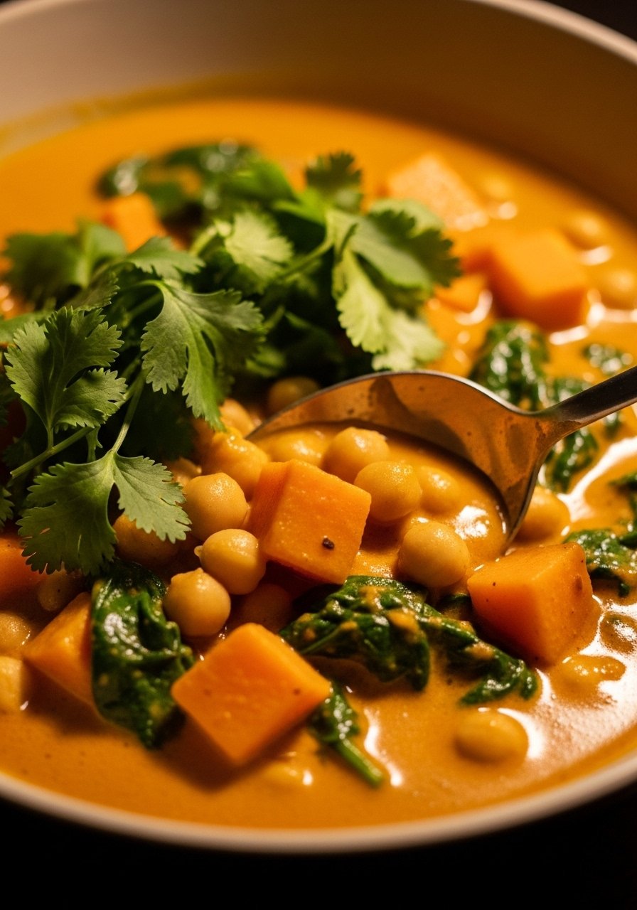 A filling plant-based curry with sweet potatoes and chickpeas. Warming spices and coconut milk provide comfort while staying nutrient-dense.