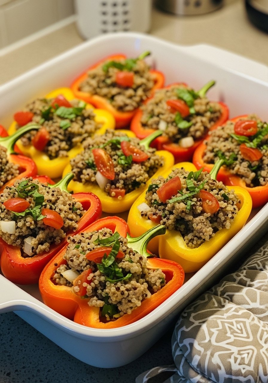 - Stuff Peppers: Fill: Spoon filling into bell peppers and place upright in a baking dish.