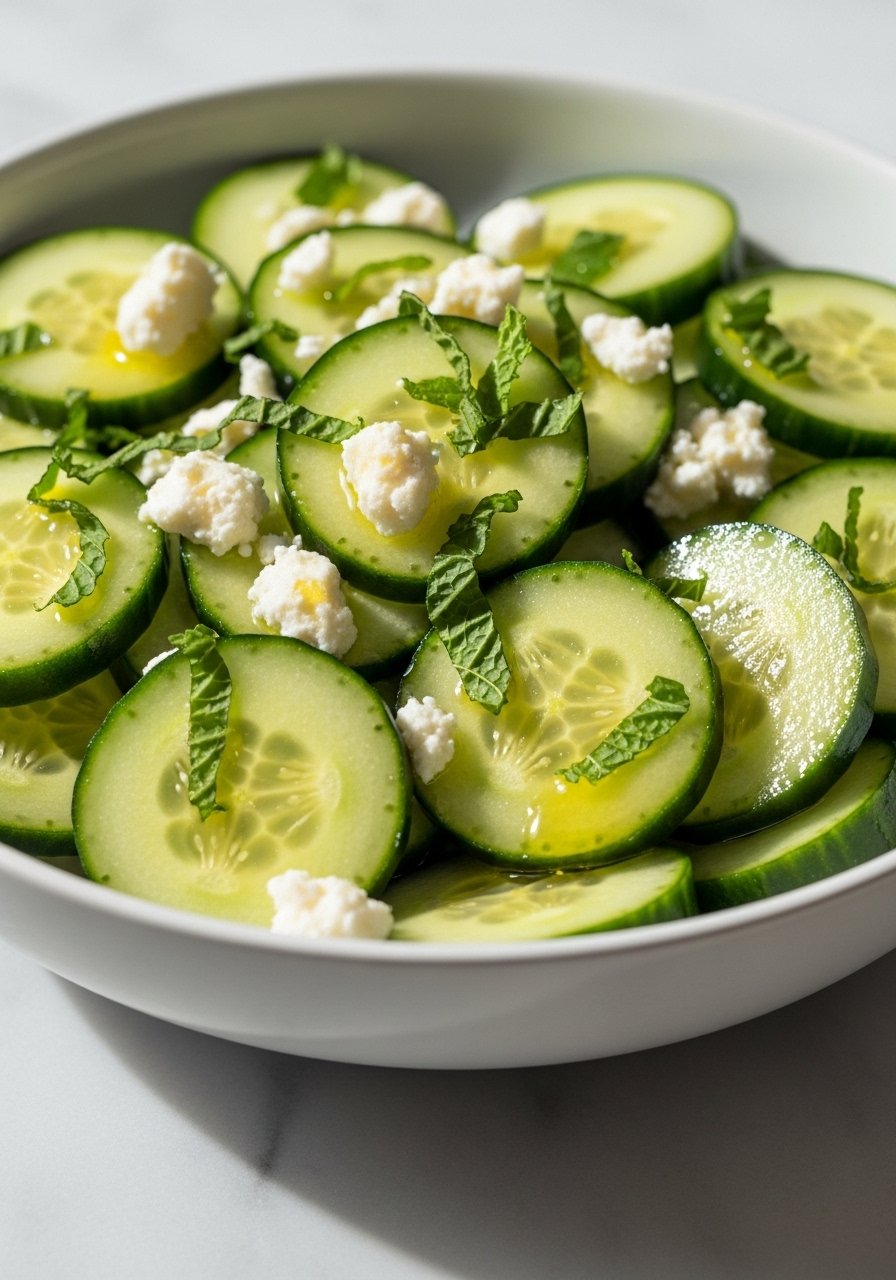 - Toss Ingredients: Combine: In a bowl, mix cucumbers, feta, mint, olive oil, and lemon juice.