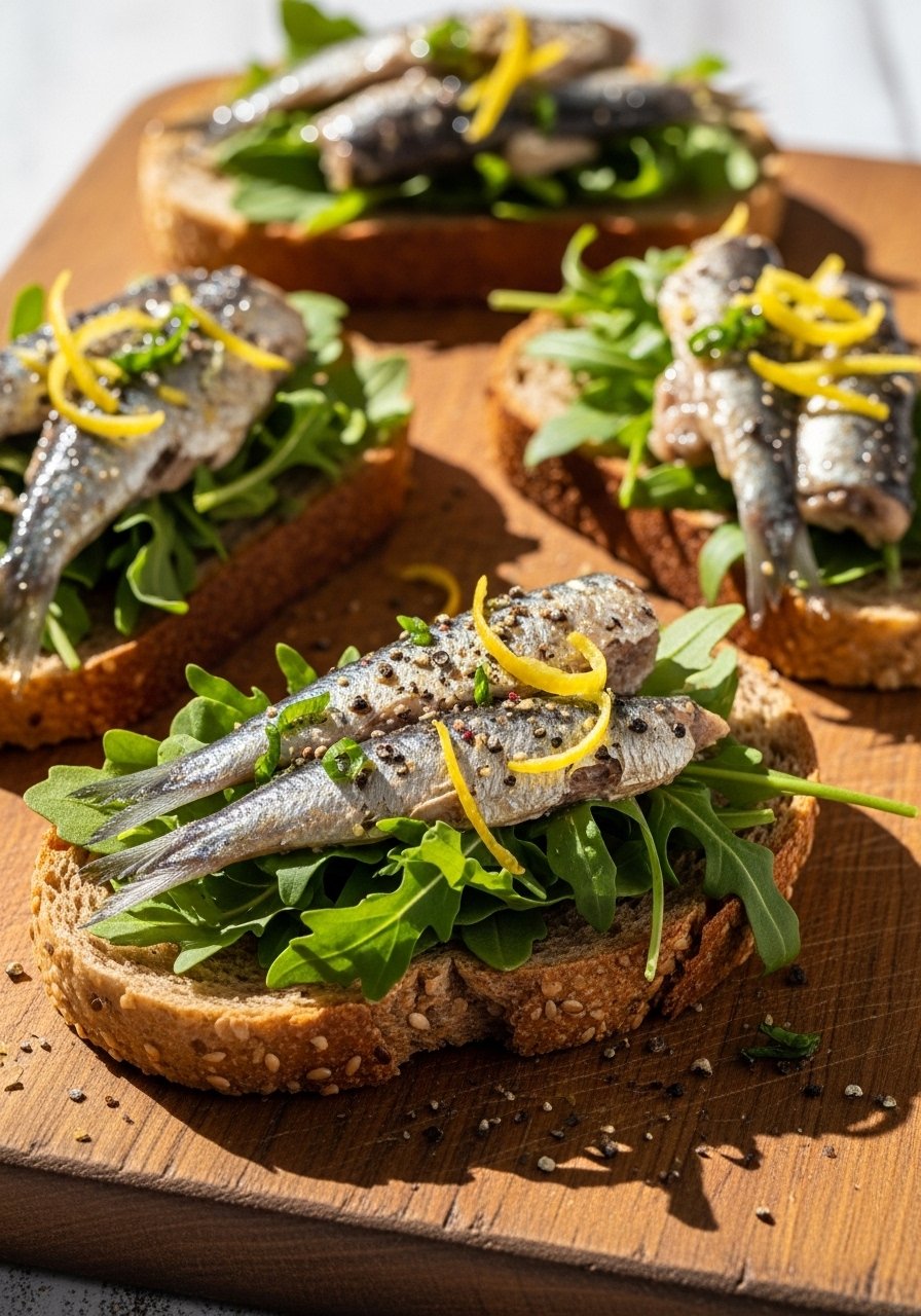 - Assemble: Layer: Top toast with arugula, sardines, a squeeze of lemon, and zest.