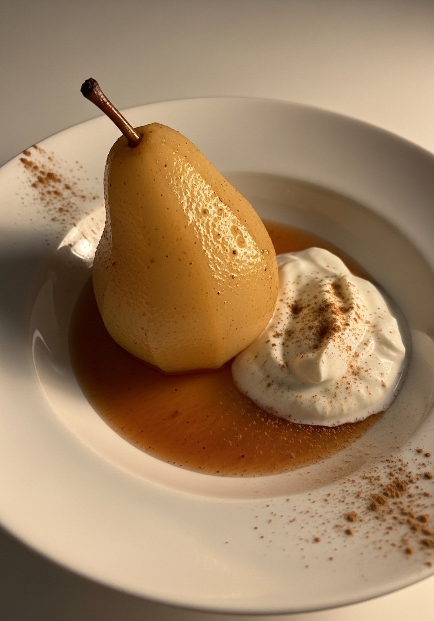 Light poached pears simmered in cinnamon-scented liquid. Served with Greek yogurt for protein—sweet, comforting, and balanced.