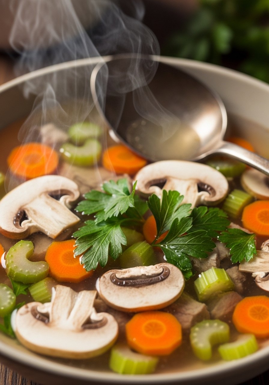- Sauté Veggies: Cook: Heat olive oil in a pot over medium and sauté carrot, celery, and mushrooms 4–5 minutes.