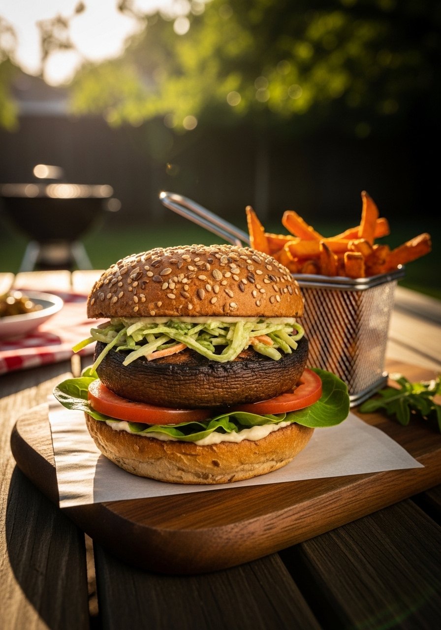 Satisfying vegetarian burger using meaty portobello caps and a tangy tahini slaw. Low-calorie yet filling, with satisfying textures.