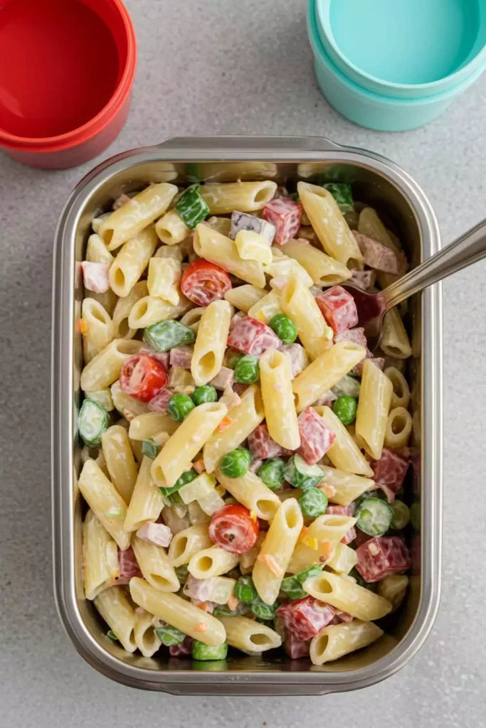 Cold pasta salad is easy to make ahead of time and holds up well in a lunchbox. It’s also an easy way to sneak in veggies and protein.