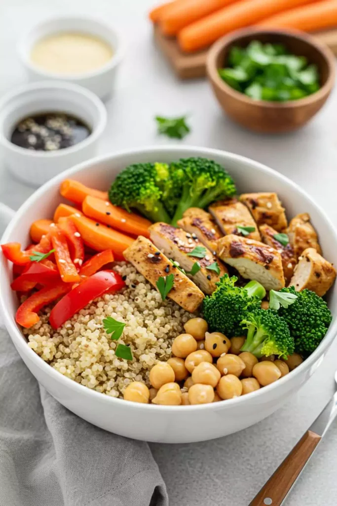 A balanced, protein-rich bowl with quinoa, veggies, and optional chicken or chickpeas. It’s healthy and filling, but still tasty for lunch.