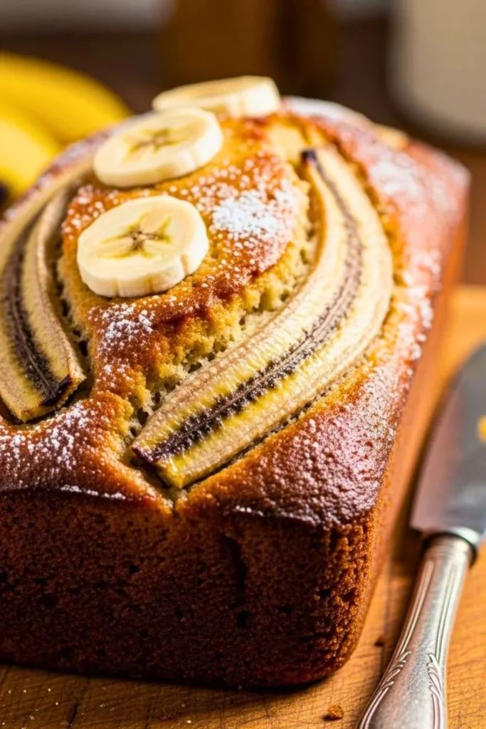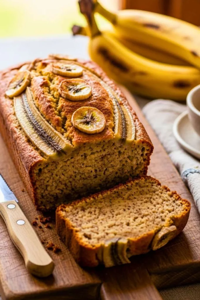This banana loaf is moist, tender, and packed with natural banana sweetness. It has a soft, fluffy texture with a lightly caramelized crust on the outside.
