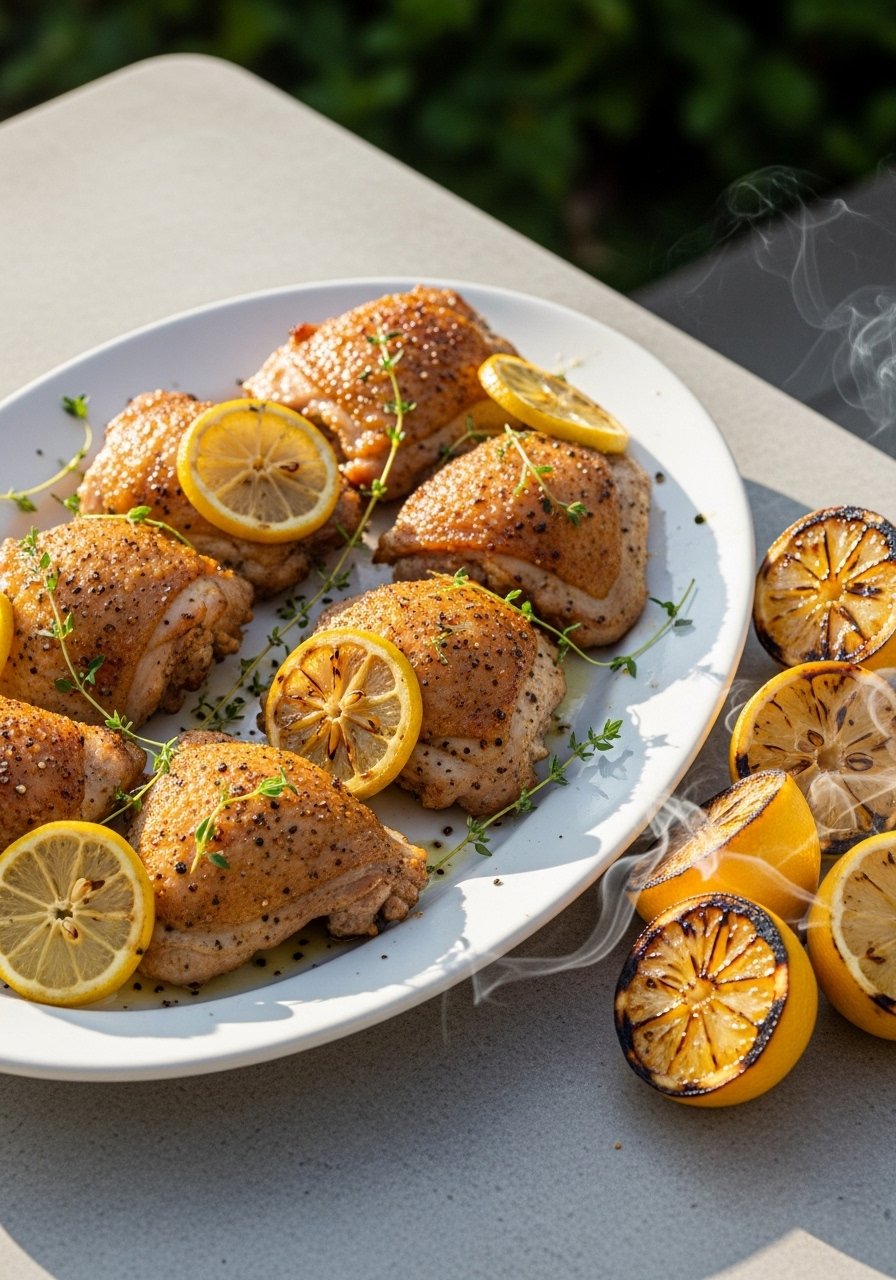 Chicken thighs stay juicy and get gorgeous browning on the griddle. Lemon pepper keeps it bright, punchy, and simple. Add charred lemon at the end for extra flavor.