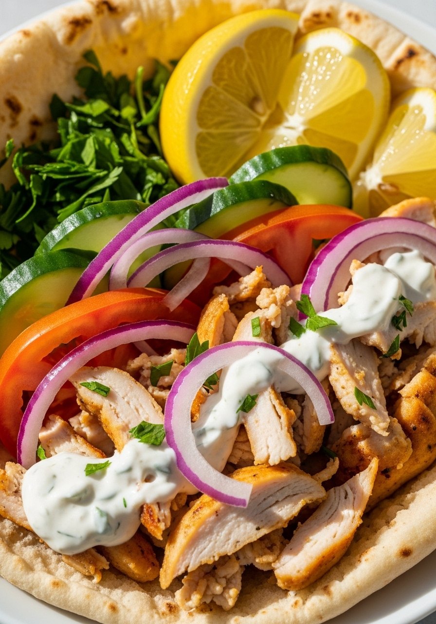 - Build bowls: Add rice, chicken, toppings, and tzatziki.