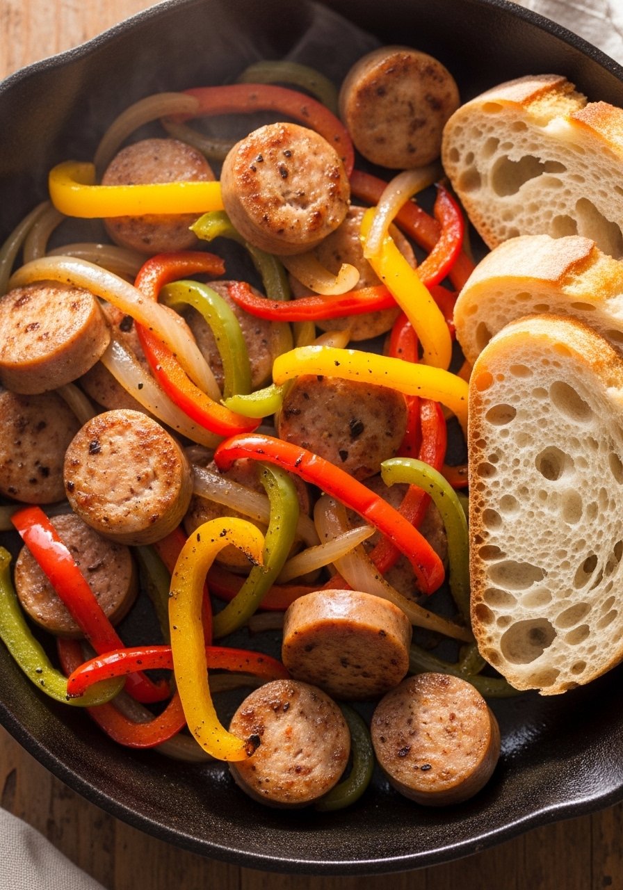 - Cook onions and peppers: Sauté 6–8 minutes until browned. Push aside.