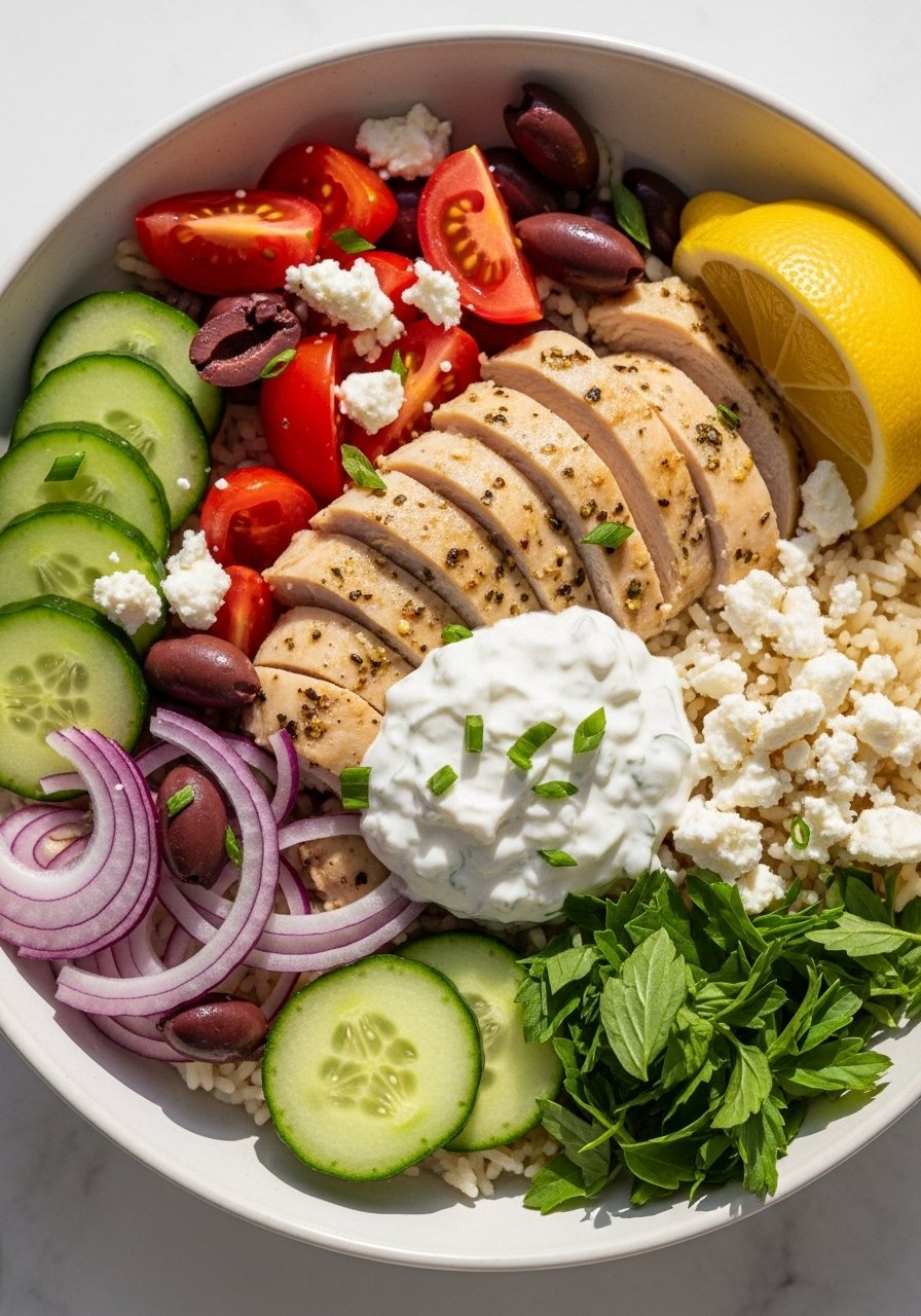 These bowls are fresh, tangy, and super filling. The chicken gets a quick oregano-lemon sear, then you build with crisp veggies and feta. It’s meal-prep friendly, too.