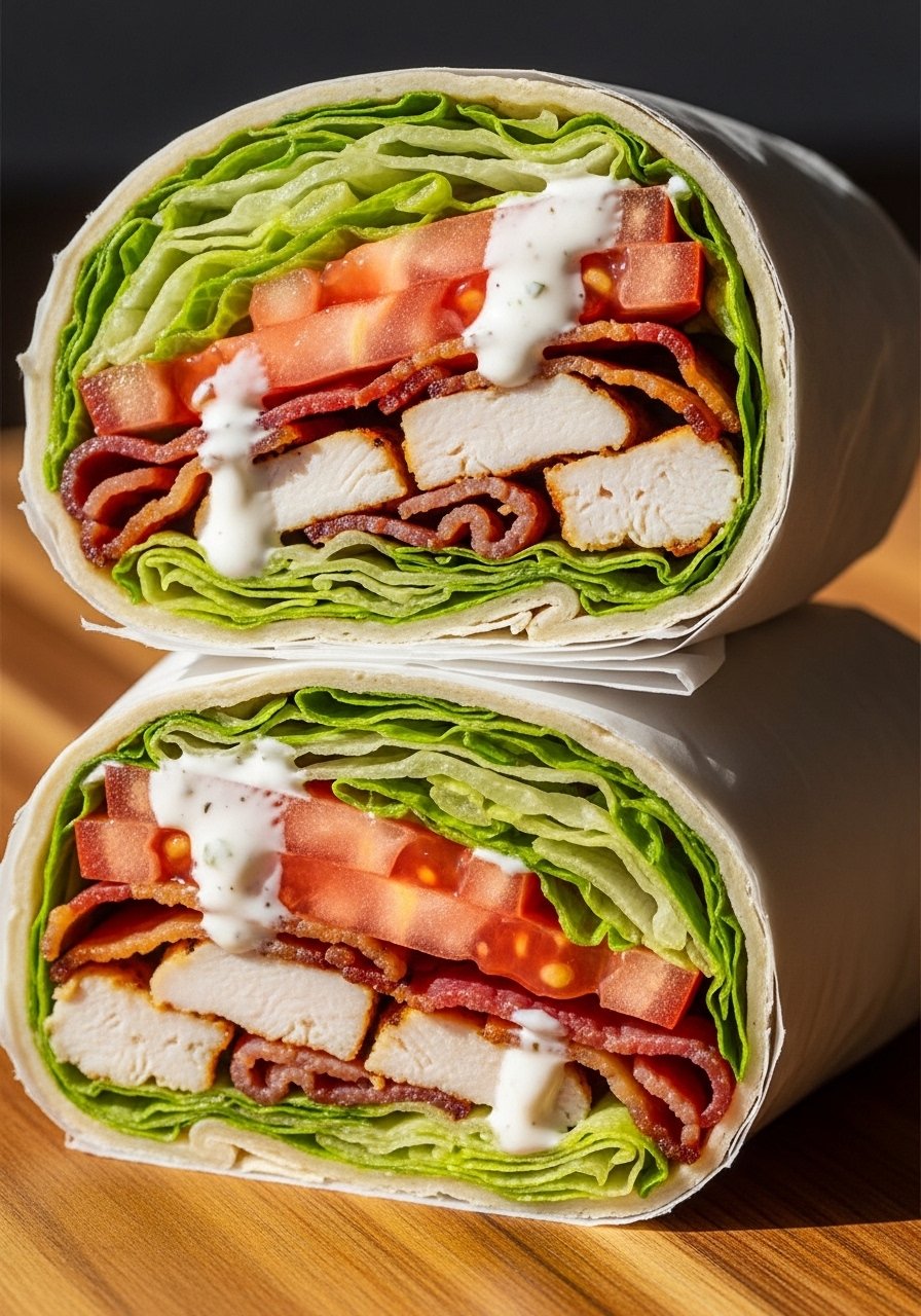 - Assemble wraps: Add cheese, chicken, bacon, ranch, and veggies. Roll tight.