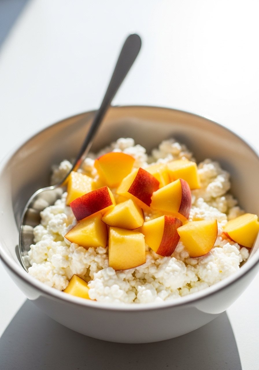 Creamy cottage cheese pairs with soft, peeled peaches for a mild, protein-rich breakfast that’s easy on digestion.