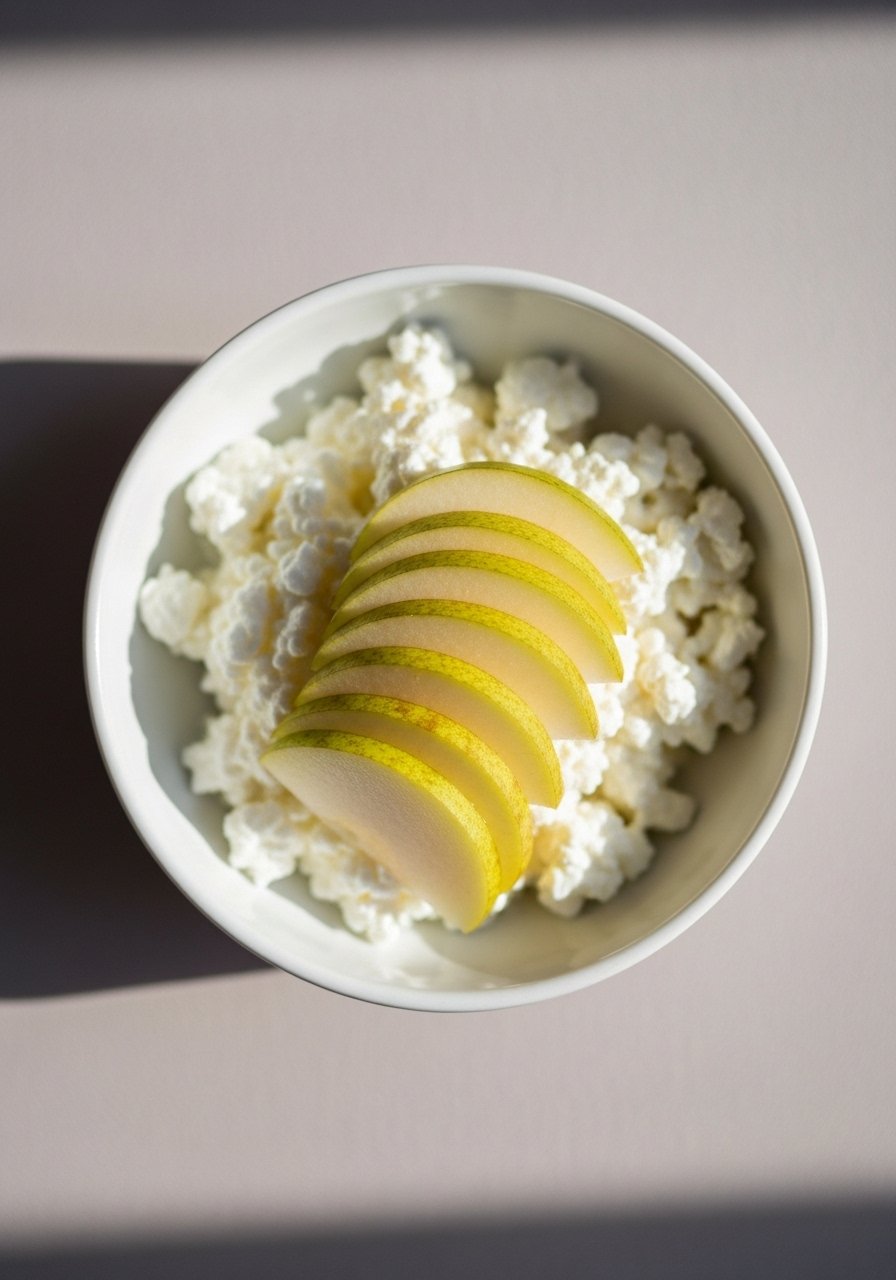 Soft pear slices paired with cottage cheese give a calm, protein-rich snack that’s mild and easy to chew.