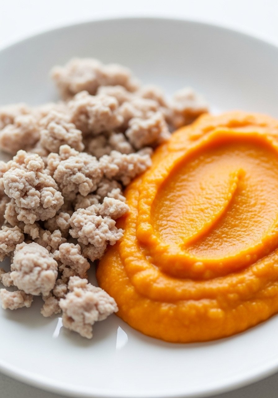 Lean ground turkey cooked gently pairs well with sweet mashed carrots for a mild, comforting dinner option.
