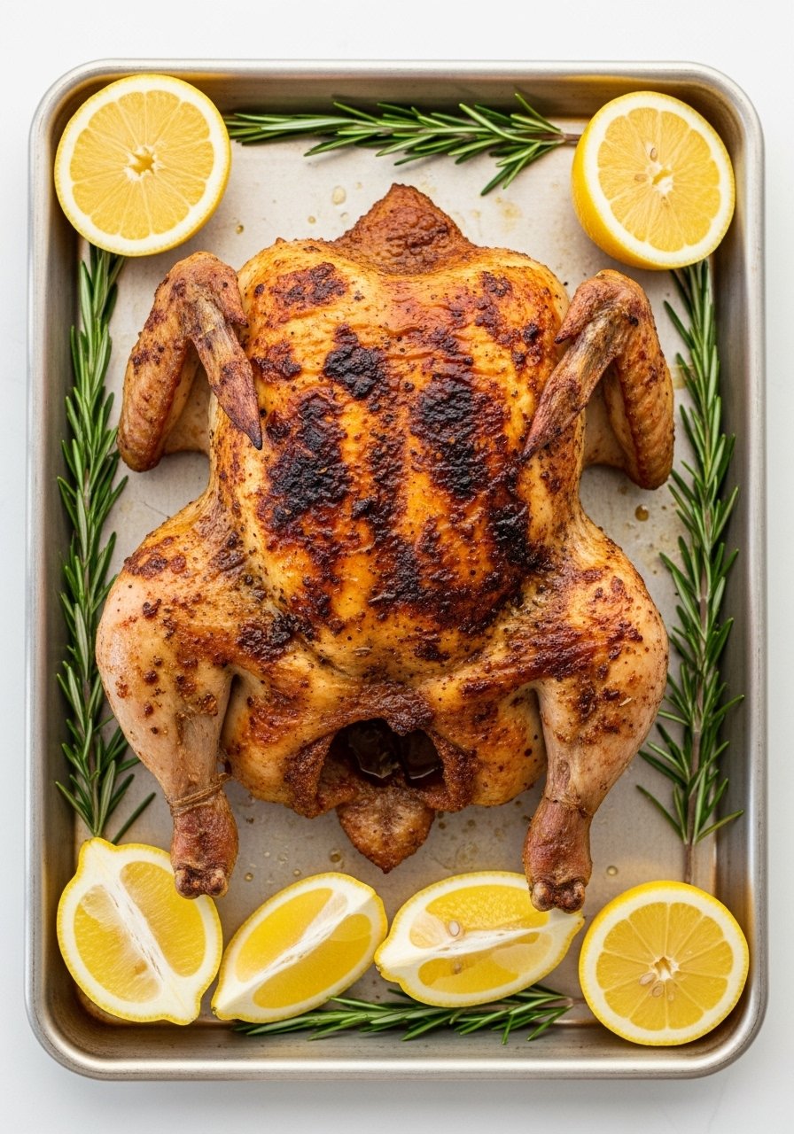 Spatchcocking reduces roast time and crisps skin evenly. Zesty lemon and mixed herbs brighten the savory roast for a family weeknight victory.