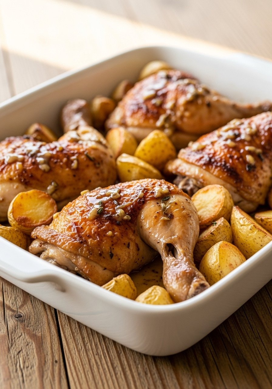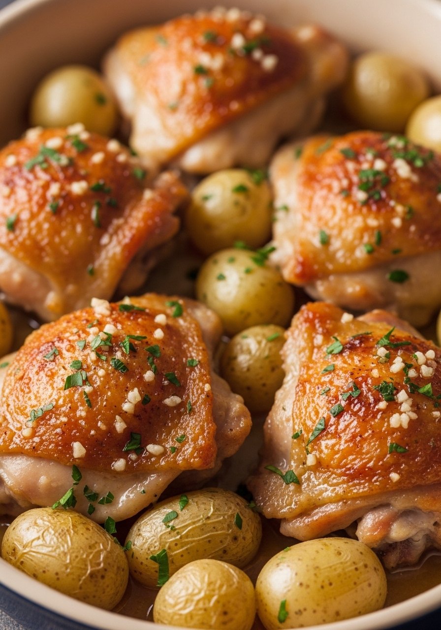 Bone-in thighs stay juicy and are budget-friendly. Garlic butter and roasted potatoes make this a one-pan comfort dinner with minimal cleanup.
