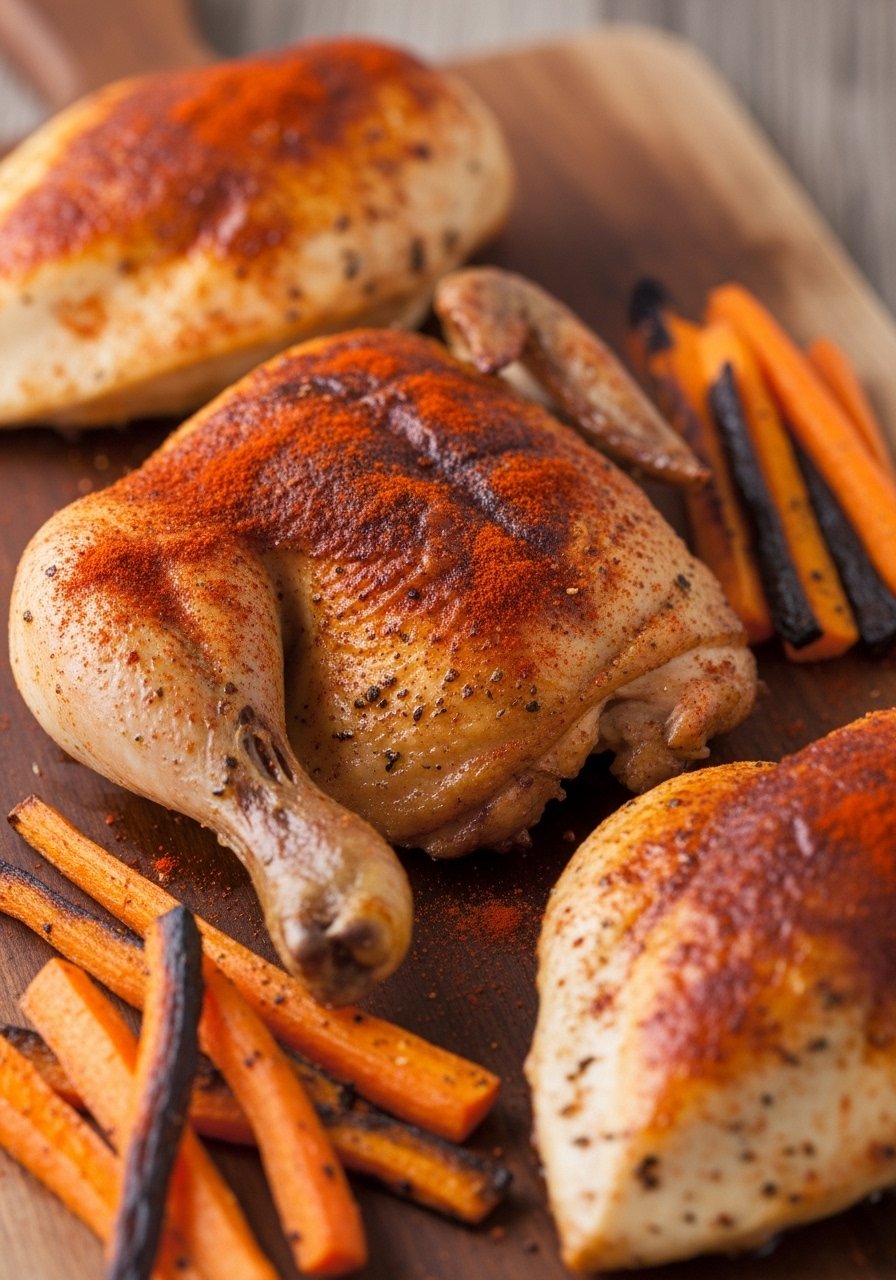 - Roast: Roast 45–60 minutes for whole chicken (or 30–40 for thighs) until internal temp is 165°F (75°C) and carrots are caramelized.