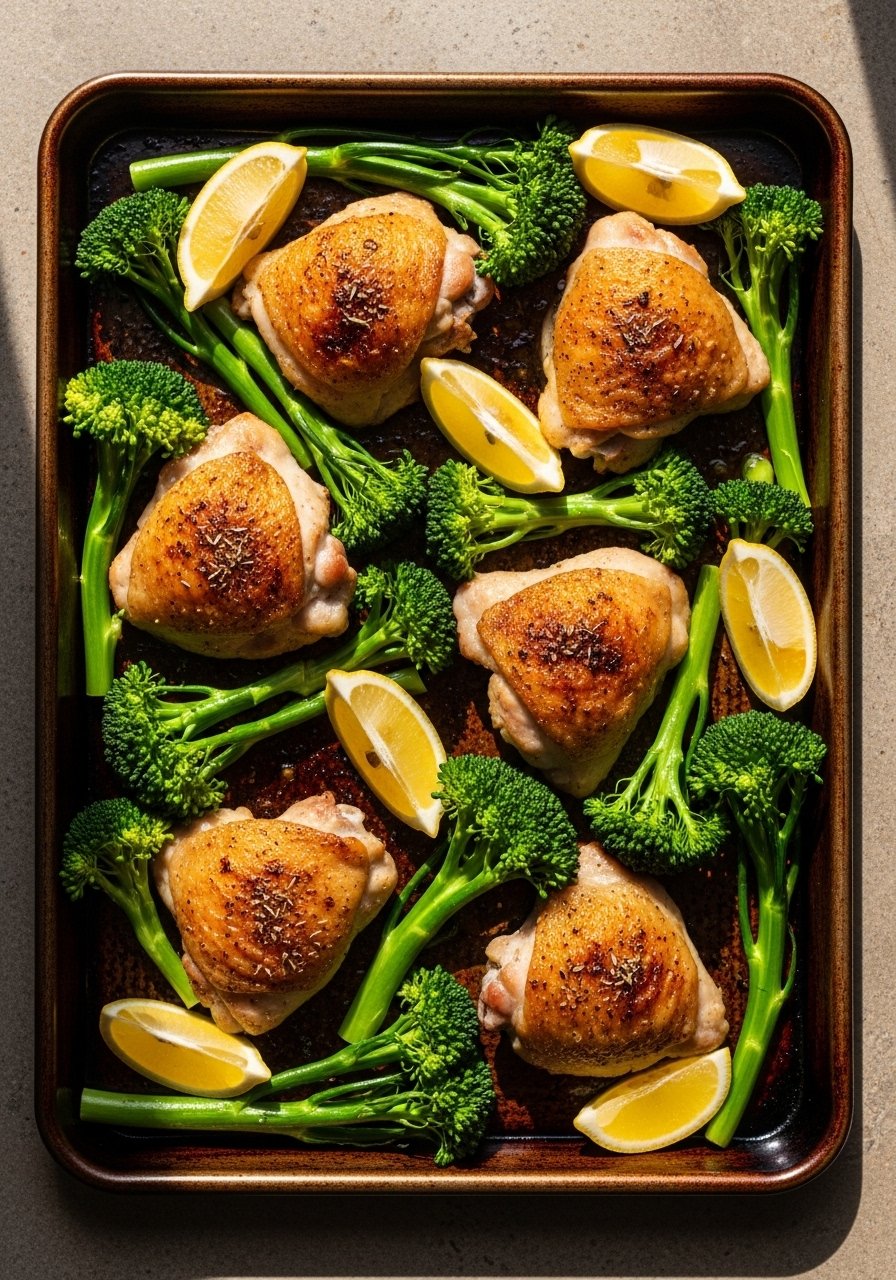 - Roast: Roast 35–40 minutes until thighs reach 165°F (75°C) and potatoes are tender; broil 2–3 minutes if you want extra crisp.