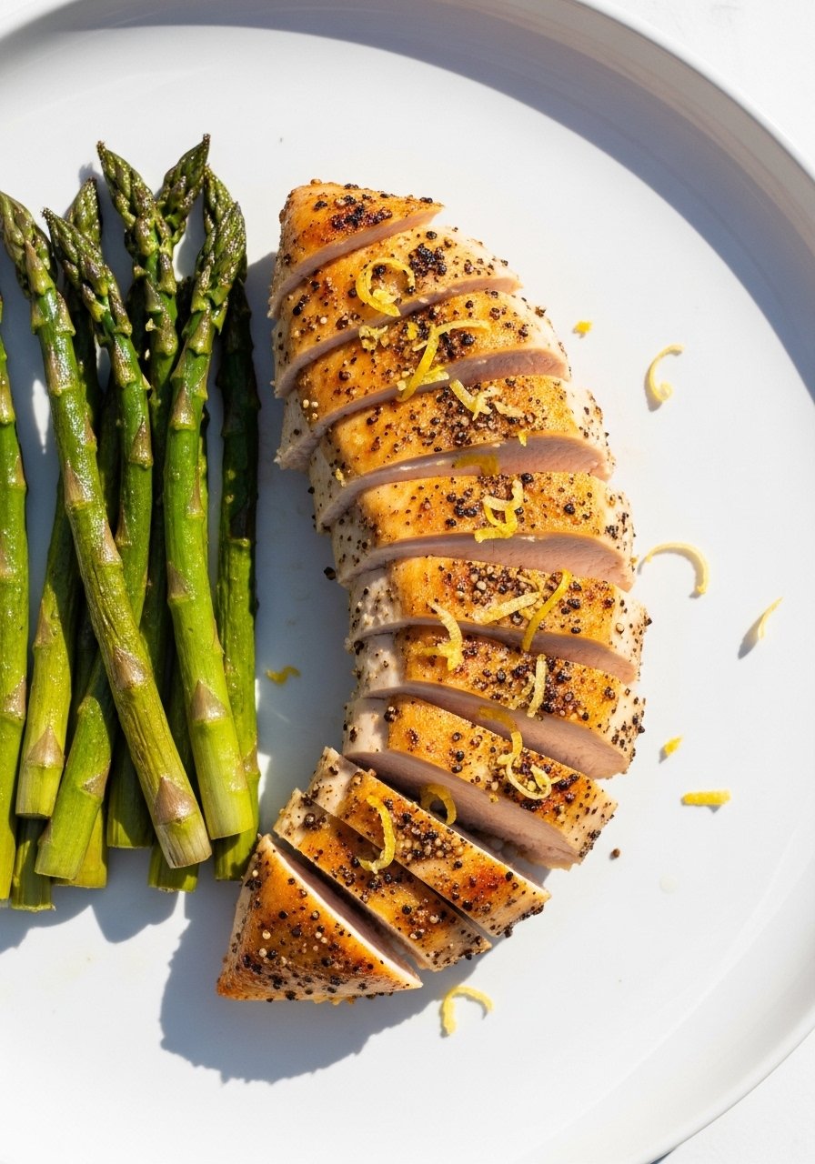 Simple lemon-pepper seasoning works wonders on chicken breasts. Roasting asparagus alongside keeps dinner bright and cost-effective.