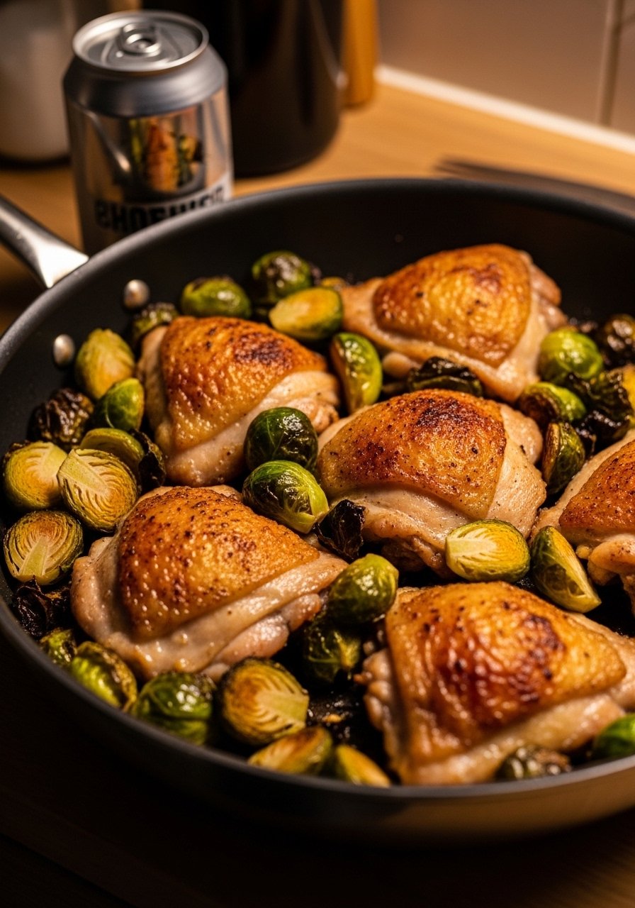 A splash of beer and oven time tenderizes and adds savory depth. Brussels sprouts roast to caramelized perfection alongside thighs.