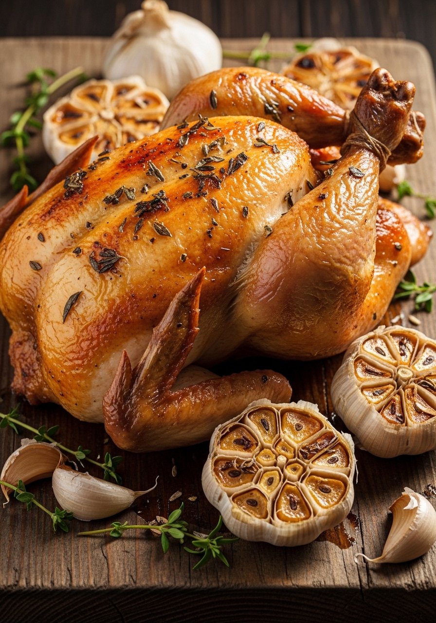 - Roast: Roast 1–1¼ hours until internal temp is 165°F (75°C) and garlic cloves are soft.