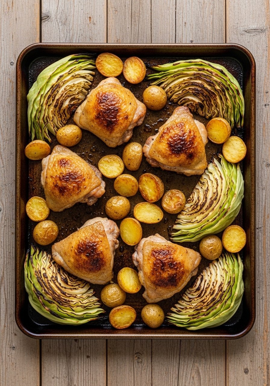 - Roast: Roast 40–50 minutes until chicken reaches 165°F (75°C), potatoes are tender, and cabbage edges caramelize.