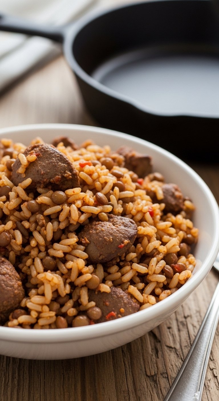 Using brown rice and lentils boosts fiber and satiety. This earthy bowl stretches protein further while staying flavorful and affordable.