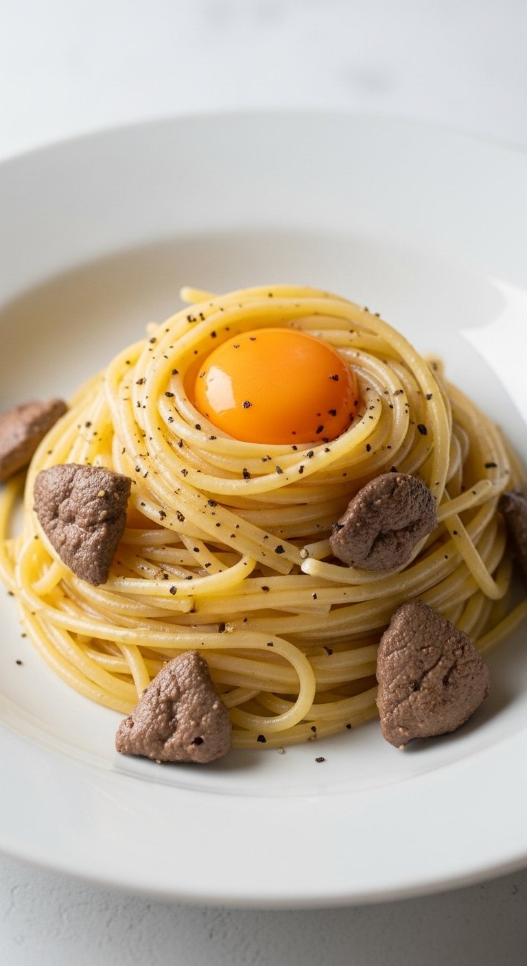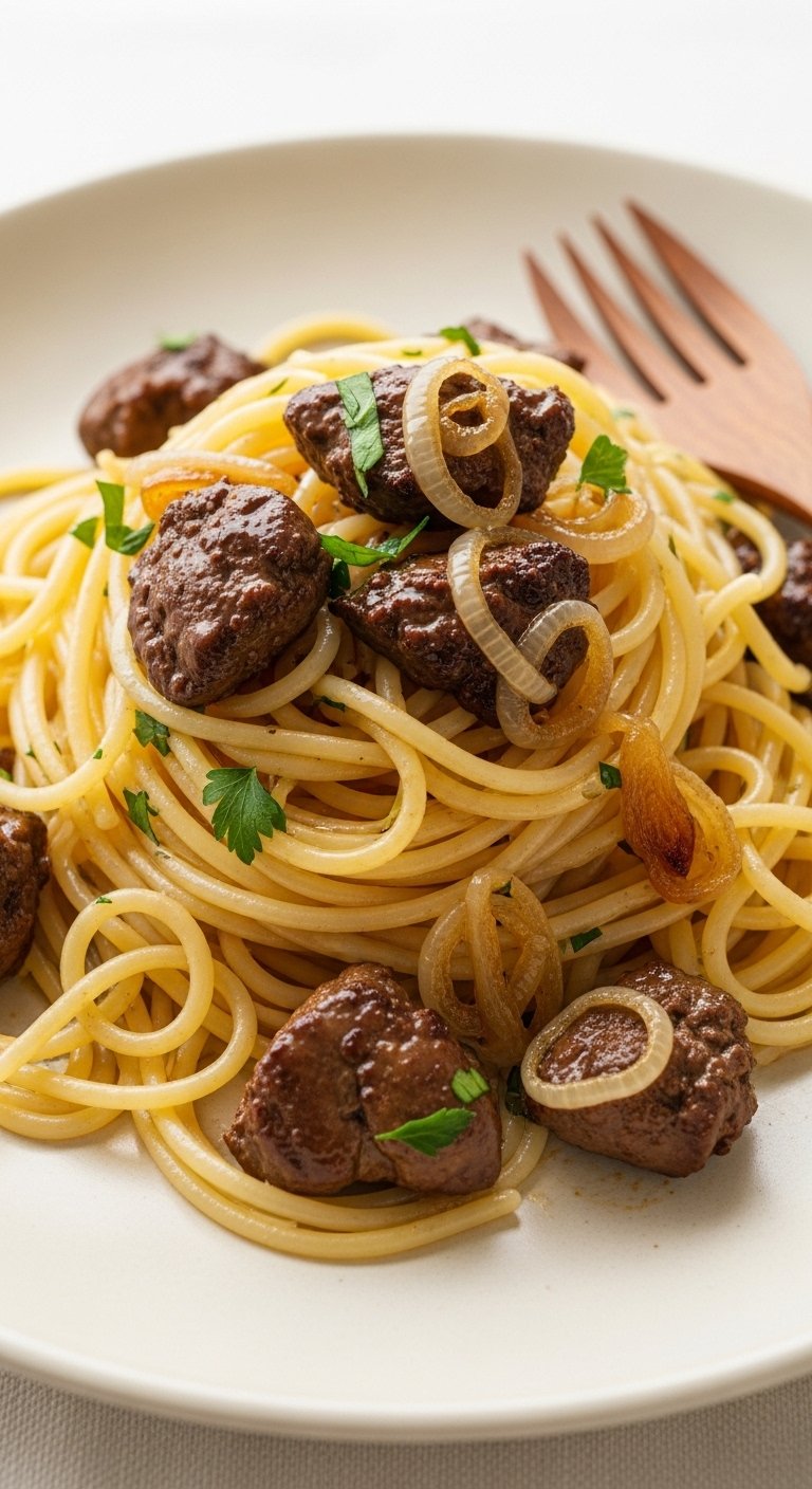 A silky, savory plate where tender chicken livers meet deglazed white wine, butter, and al dente spaghetti. It’s elegant but quick, with a smooth sauce that clings to each strand for deep, comfort-food flavor.