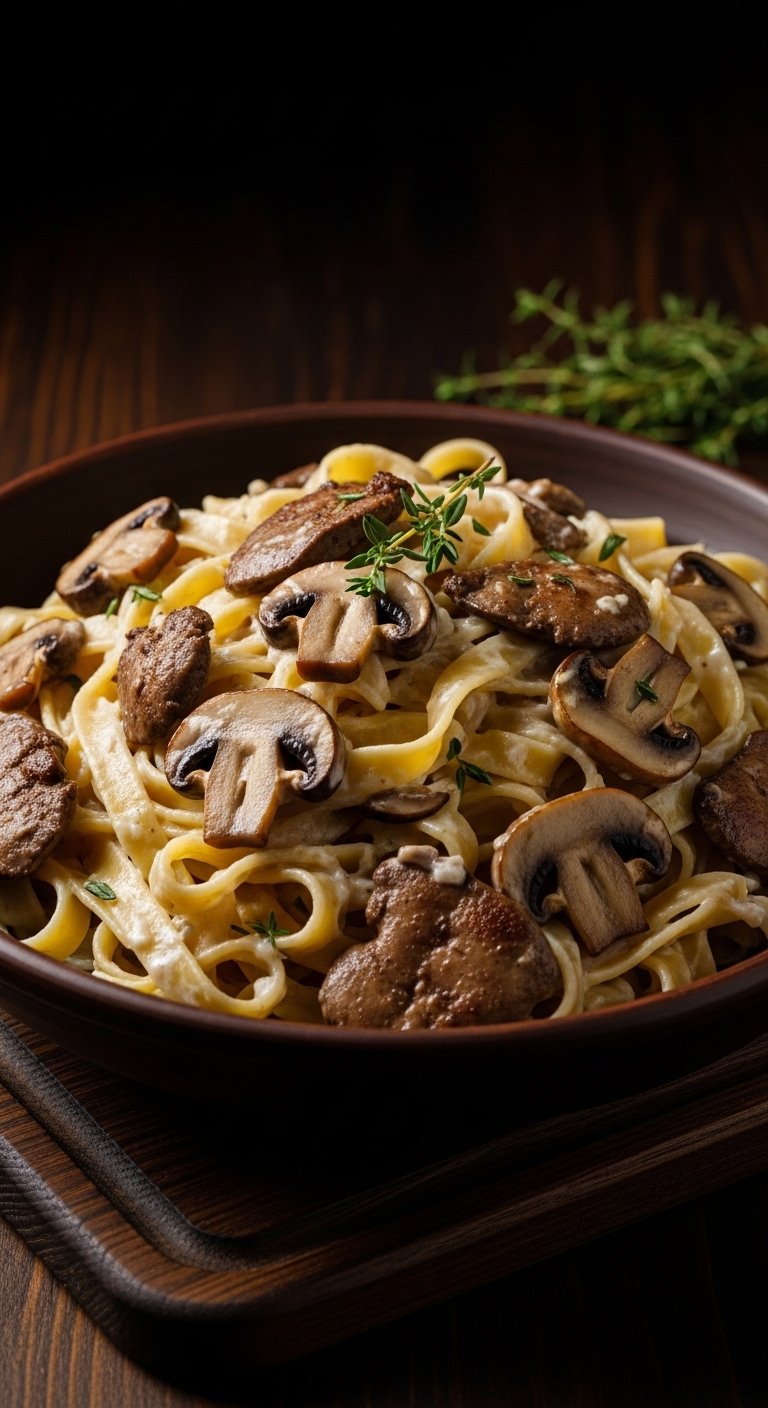 Earthy mushrooms and fragrant thyme balance the richness of chicken liver in a velvety cream sauce. Tagliatelle soaks up the sauce, making each bite lush and deeply satisfying—ideal for a cozy evening.