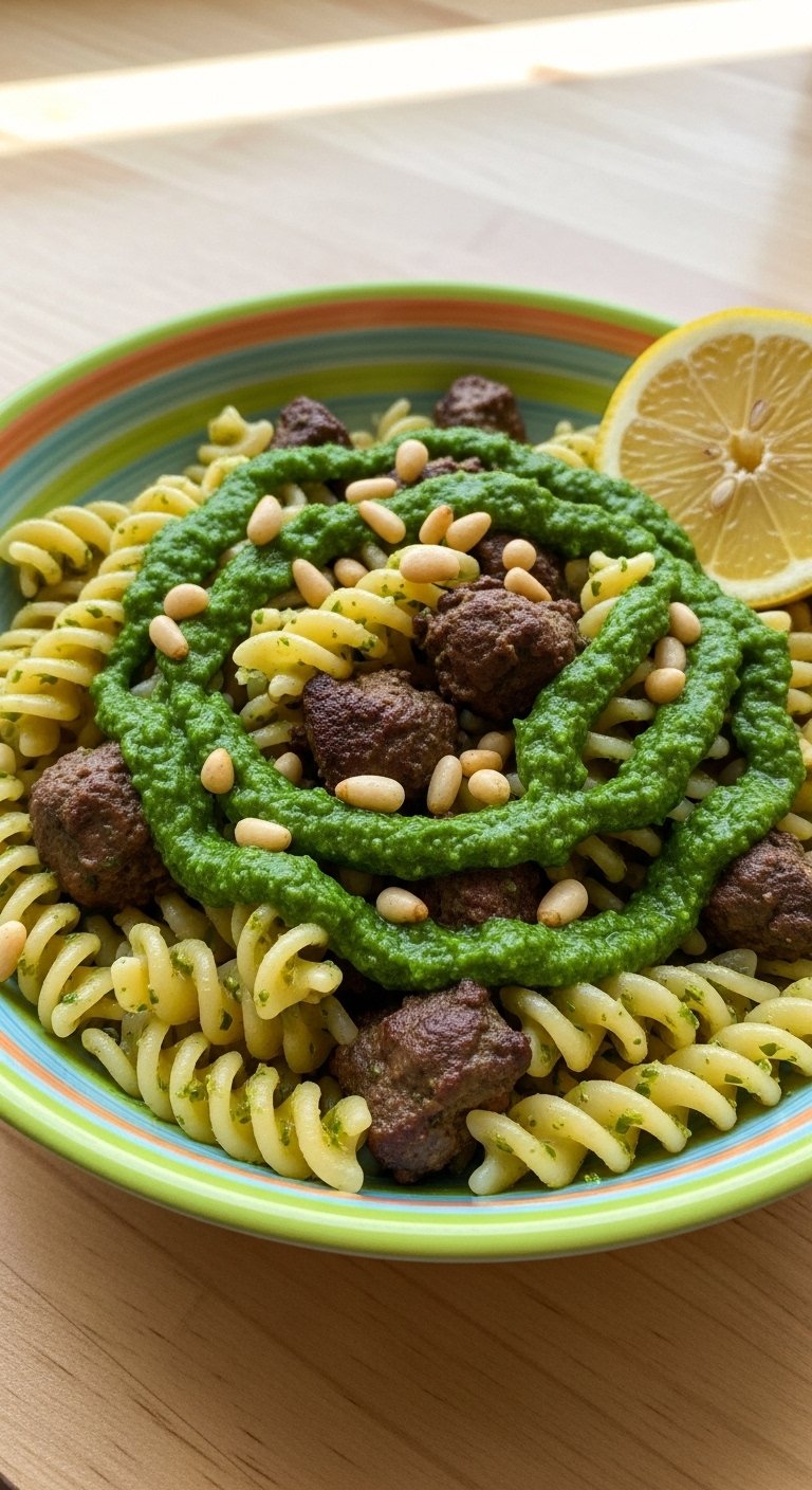 Herby basil pesto pairs unexpectedly well with chicken livers for a savory, slightly sweet contrast. Fusilli’s spirals hold the pesto and little liver pieces, while toasted pine nuts add crunch.