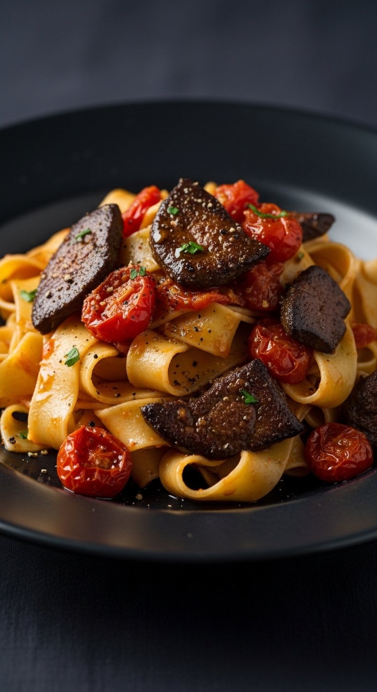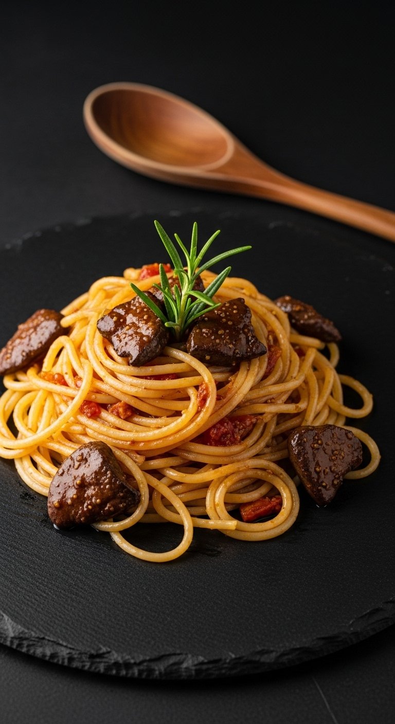 Sweet figs and savory tomato create a complex sauce that highlights chicken liver’s savory richness. Rosemary gives aromatic depth, ideal for a slightly unconventional but elegant pasta.