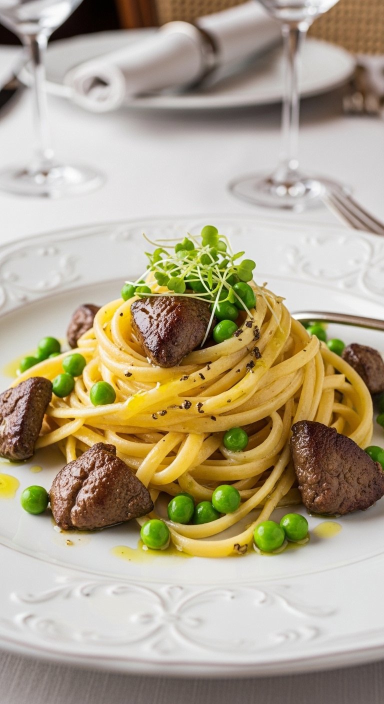 A light drizzle of truffle oil elevates this creamy fettuccine to decadent territory. Peas add sweetness and color, balancing the robust flavors of chicken liver for a sophisticated plate.