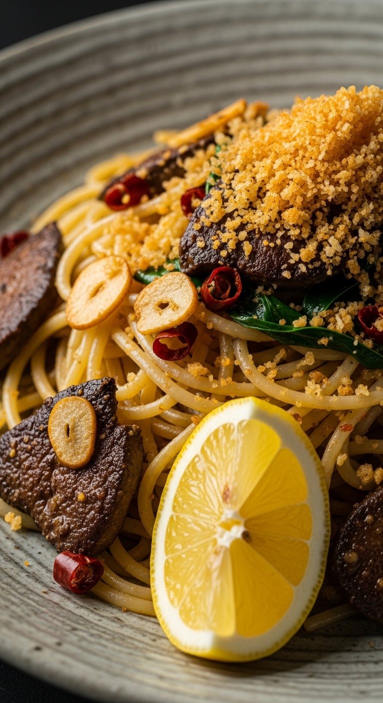 Toasted garlic and chili give this pasta a kick, while crispy breadcrumbs add texture. The chicken livers provide bold flavor—this is a rustic, satisfying dish with crunchy contrast.