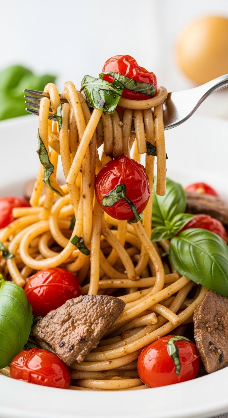 Sweet cherry tomatoes and a touch of balsamic brighten the savory livers, while bucatini’s hollow center carries sauce beautifully. Fresh basil finishes this vibrant, balanced pasta.