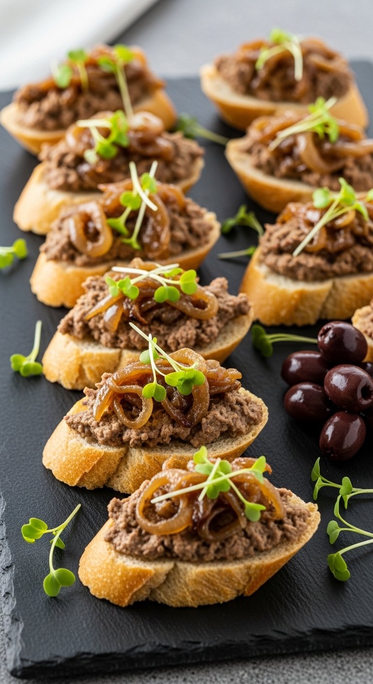 - Assemble: Spoon livers onto toasted baguette slices and top with caramelized onions and thyme.