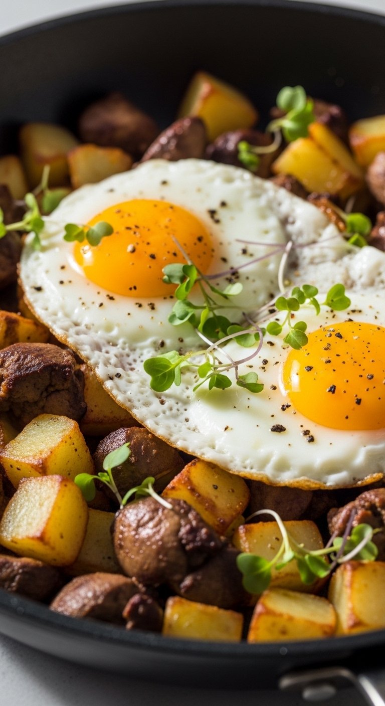 - Make Wells: Create wells for eggs and crack them into the skillet. Reduce heat and cover until whites set.