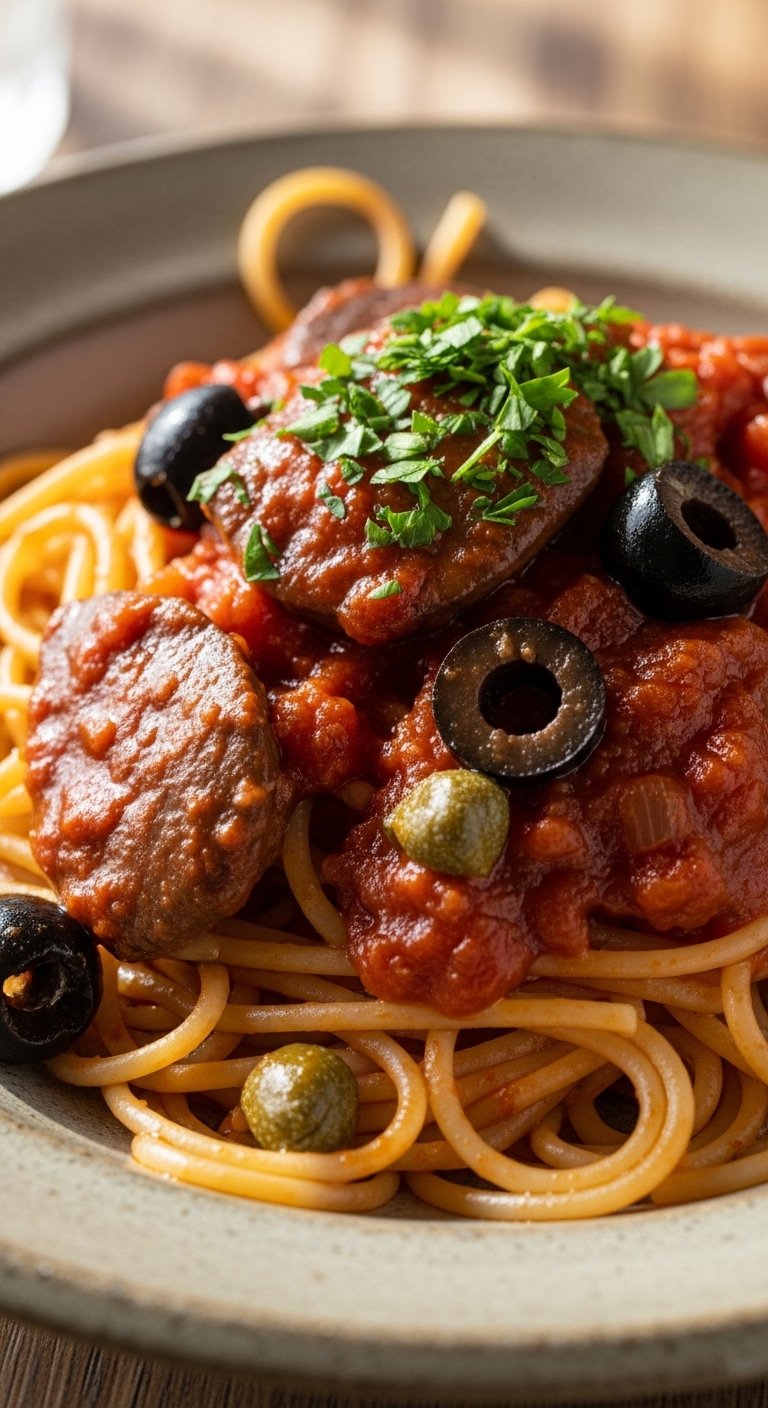 - Add Tomatoes & Briny Ingredients: Add tomatoes, olives, and capers; simmer 8 minutes.
