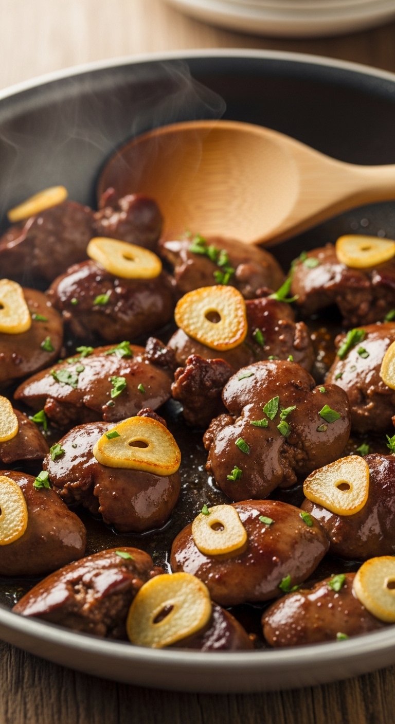 A straightforward, pan-sautéed dish: tender livers, golden garlic, and a hit of butter. Rich, silky texture with bright parsley to finish—comfort food in minutes.