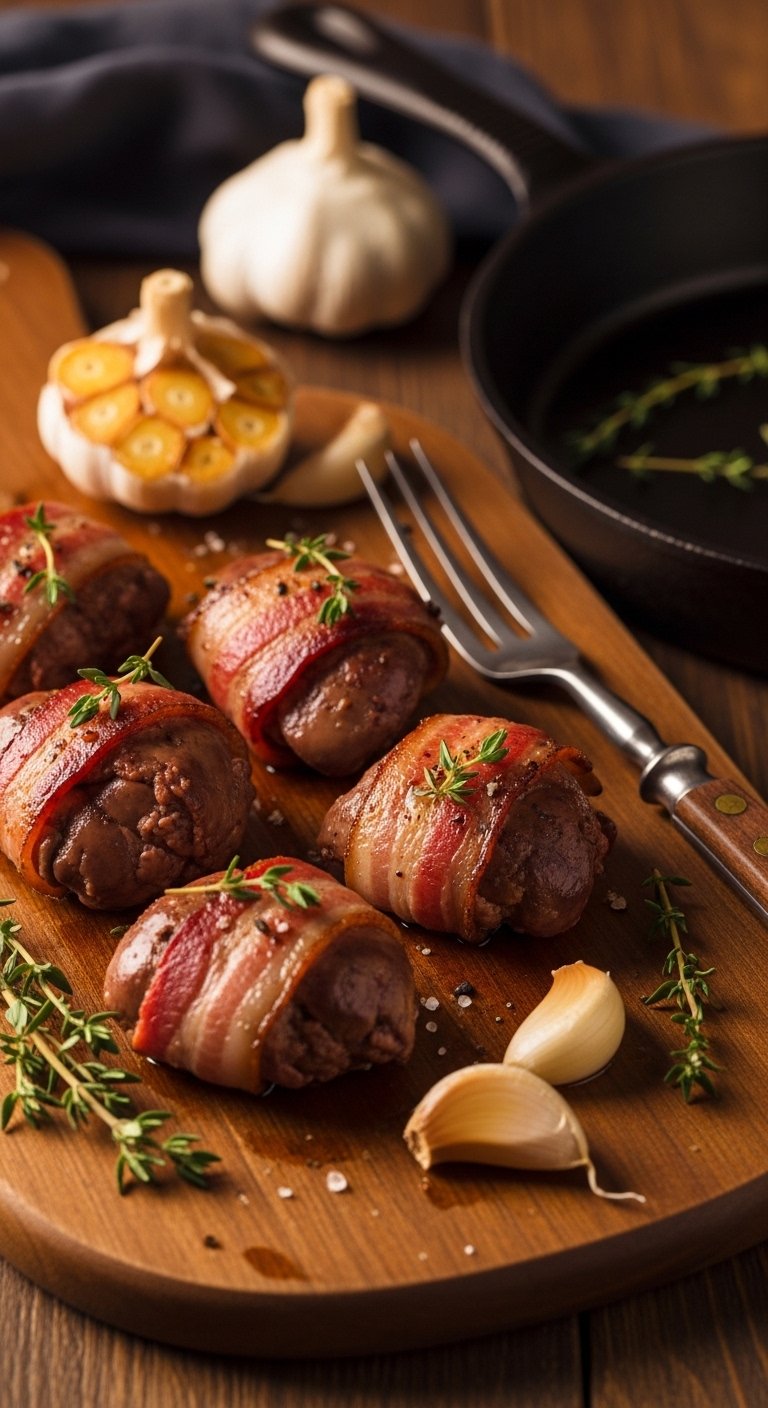 Smoky bacon and garlic make livers even more irresistible. Thyme adds earthiness—serve as a party appetizer or hearty main.