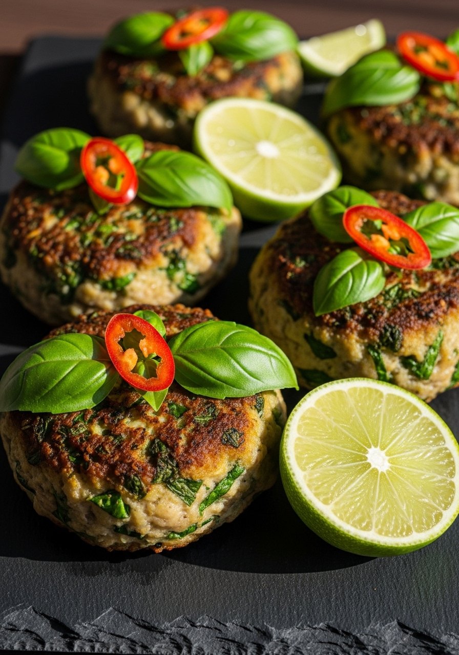 - Combine Flavors: Mix chicken, basil, fish sauce, lime zest, lime juice, egg, almond meal, and pepper.